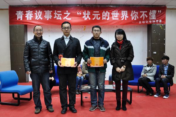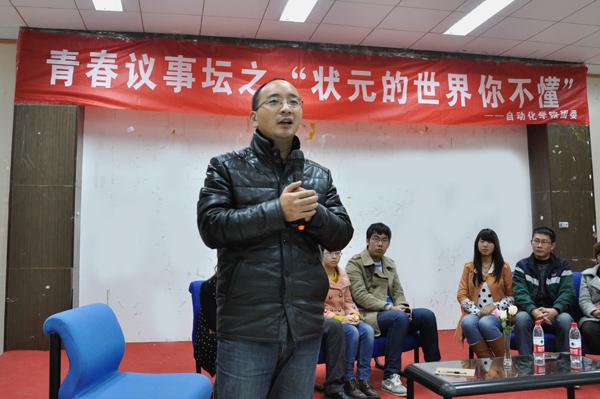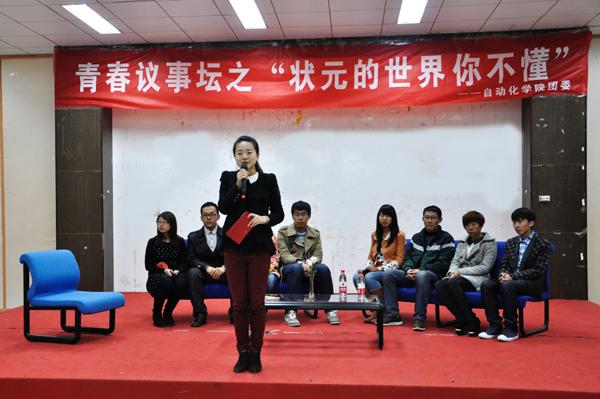 12月4日晚,青春议事坛之“状元的世界你不懂”活动于将军路校区艺术中心多功能厅举行,八名学生代表围绕“高考文科状元刘丁宁退学复读”事件展开了热烈的讨论。人文与社会科学学院教师娄和标、我院团委书记季娟以及各年级辅导员作为评委出席了本次活动。 2013年,辽宁省本溪市文科状元刘丁宁以668(+10)分被香港大学中文系录取,并获72万元人民币奖励。10月初,刘丁宁离开港大,目前已经回本溪高中复读。对此,刘丁宁说,她追求更纯粹的国学,梦想进入北京大学中文系,北大也更适合自己。 八名学生代表首先表明了各自的立场,支持刘丁宁的学生认为这位女生的可贵之处,在于她遵从了自己的内心,敢于放下一些功利的考量,去追求契合自己心灵的国学梦、北大梦;反对的同学则认为刘丁宁刚到港大,没有充分了解港大及专业情况,就仓促退学,是一种不成熟的举动。接着同学们从北京大学与香港大学教学理念的不同为切入点,深入探讨了有关中西方教育和人才选取倾向上的差异、大学生的适应能力等问题,并且从“状元的世界你不懂”这一议题联系到了大学生的实际生活。八名学生代表在思辨的讨论中碰撞出了思维的火花,呈现了不同思想对同一事件的不同解读,展现了当代大学生有思想、有创造力的青春风采。在学生代表的交流讨论中,现场观众们也就“如果你是刘丁宁会做何种选择”及“你是如何适应大学生活”的两个话题展开了激烈的讨论,现场气氛活泼热烈而又井然有序。 最后,西方哲学博士娄和标对本次青春思辨活动进行了总结。他说道,我们每个人都有各自独特的价值取向和自由选择权。只要这样的价值取向和自由选择权没有违法乱纪,也没有违背社会伦理道德,那么我们每个人就都应该尽可能地理解其价值取向和自由选择权。