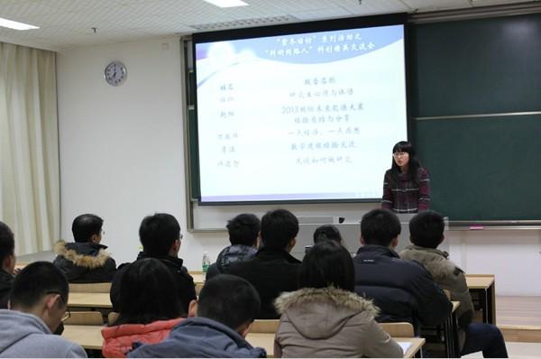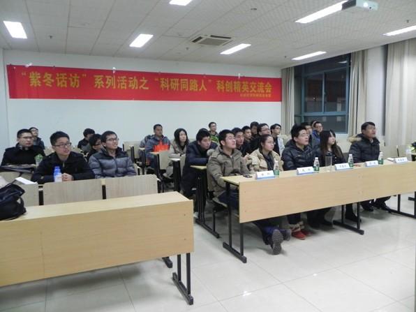 2013年12月10日晚6:30,由番茄app 研究生会主办的“紫冬话坊”系列活动之“科研同路人”科创精英交流会活动在A18楼218教室顺利举行。本次活动邀请到我院硕士研究生任仁、李洁、万骏炜、赵阳以及博士研究生许德智五位学术精英为到场同学们作报告,研究生辅导员刘斐文老师也莅临现场出席了本次活动。