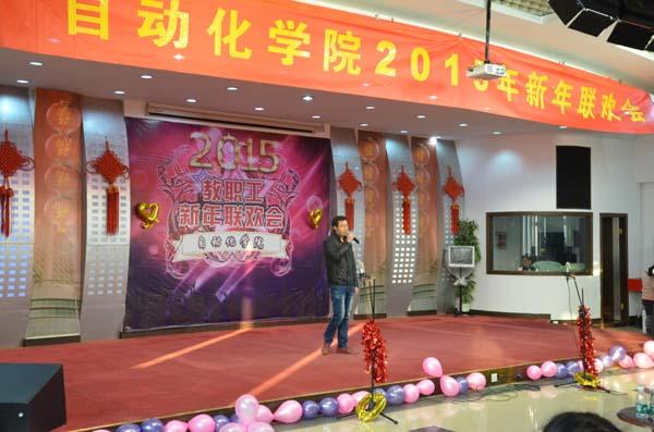 联欢会的演出节目在学院领导班子带来正能量的合唱《光阴的故事》中拉开序幕。悠扬的歌曲,优雅的和声过后,由学院机关带来了2014年最火的《小苹果》舞蹈。学院院长姜斌、副书记沈伯秀深情的演唱了《为了谁》,现场PPT中循环播放着本年度学院师生经典的系列照片,深深感动着在场的教职工。学院副院长赖际舟的一曲《恭喜发财》祝福大家新的一年红包天天有,财源滚滚来。由测试系李开宇老师演绎的《故乡的云》唱出了远离故乡的游子深切的思乡之情。