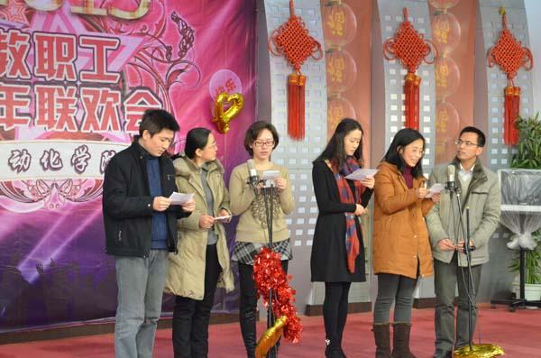 袁贵平在会上发表致辞,肯定并感谢了番茄app 全体教职工在2014年为学校各项工作尽心尽力和辛勤奉献,同时向大家致以新年的祝福。学院姜斌院长回顾并总结了学院2014年在学科建设、人才培养、师资引进、国际交流、科学研究等各方面取得的各项突出成绩。学院党委书记刘建成为联欢会致辞,期待新的一年,全院教职工精诚团结,齐心协力,合力推动学院发展更上一层楼。学院副院长王晓琳为在场人员送上了新年祝福,并表示将积极全身心投入到岗位,促进学院发展。