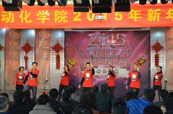 学院2013年底以及2014年新入职的教工合唱了《明天会更好》共同祝福着学院明天更美好。飞控所的胡钡老师带来的萨克斯独奏《夕阳西沉》、《卡萨布兰卡》悠扬旋律赢得了阵阵掌声。电工中心老师的合唱的《七子之歌》萌萌哒的效果令大家耳目一新。由学院辅导员组成的“教育超市楼上歌舞团”充满活力与魅力的舞蹈《小鸡小鸡》将联欢会推向了一个小高潮。在学校各项工作积极主动融入国际化的大环境下,由电气系姜文颖老师一曲女生独唱《Colors of The Wind》瞬间也将联欢会的档次提升到了国际化潮流中。