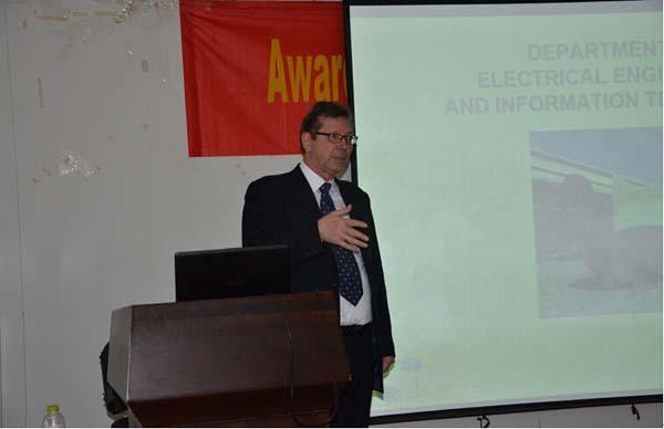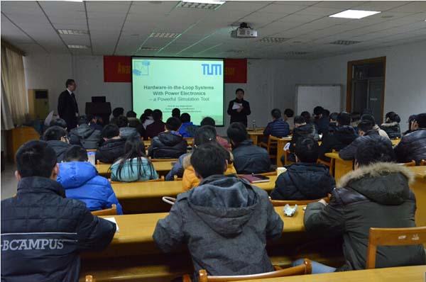 Kennel教授在智能楼四楼报告厅做了题为“Hardware-in-the-Loop Systems with Power Electronics � a Powerful Simulation Tool”的学术报告,报告会由电气工程系主任黄文新教授主持,电气系师生积极参加了报告会。Kennel教授首先简要说明了慕尼黑工业大学电气工程与信息技术系的概况,介绍了个人主要研究领域,接着重点报告了“硬件在环系统”中虚拟电机的概念及建模实现方法。随后,Kennel教授和师生们进行了热烈交流,并对大家的提问进行了详细的解答。Kennel教授精彩的演讲和前沿的学术思路引起老师和研究生的极大兴趣,报告在热烈的掌声中结束。