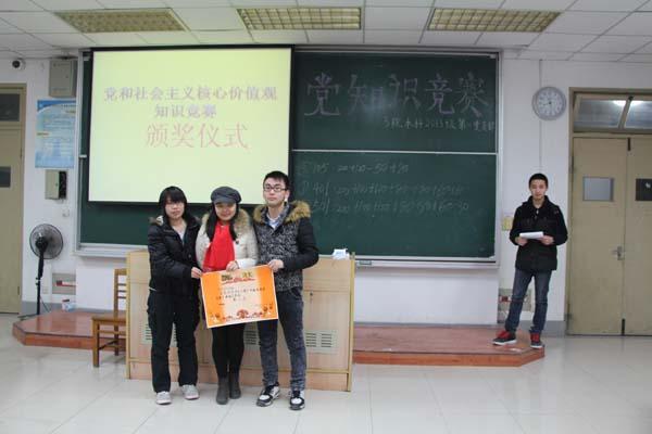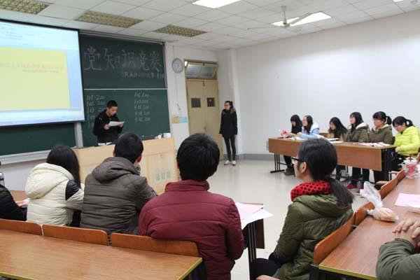 为响应党的号召,培育和践行社会主义核心价值观,三院2013级本科生第一党支部于2013年12月26日晚7点,在将军路校区6102教室举办了党内主题知识竞赛,支部全体学生党员,入党积极分子和辅导员汤呈懿老师参加了本次活动。