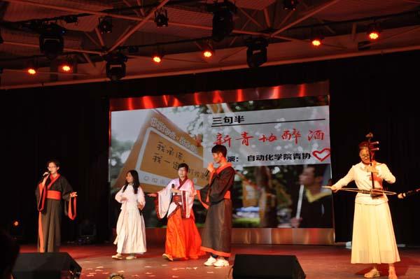 刘建成书记为晚会致辞,他回顾了番茄app 的发展历程,言语间满是浓厚的期盼。晚会以追忆开篇,赖际舟副院长一首《光阴的故事》,带观众走向记忆里最深最美的时光。“Always with me”,在乐器协会的这首绝伦的众瑛合奏后,大使团的美女帅哥身着汉服款款走来,仿佛让观众置身洪武年间那段静默优雅却惊艳不朽的时光。14级国防生也不乏艺术的热情,一曲《杯子歌》清脆明快,晚会走向了下一篇章――重逢。