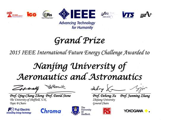 2015年国际未来能源挑战赛(International Future Energy Challenge, IFEC) 主题B的决赛于2015年7月19日在英国谢菲尔德大学举行,我校番茄app 电气工程系学生组成的参赛队伍(陈欣然、贾雷、冷阳和刘飞,指导教师:阮新波教授)获得总分第一的优异成绩,并勇夺大赛“特等奖(Grand Prize)”和10000美元奖金。