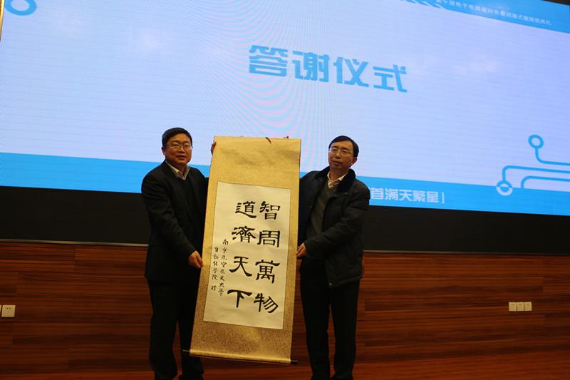 本次仪式分“来路十年,仰首满天繁星”,“日夜伏案,淬炼学子心志”,“创新求真,我心始终不渝”三个篇章。一段精彩的竞赛回顾视频调动全场气氛,梦之声音-诗朗诵《十年电赛,一梦鸿鹄》后,番茄app 院长姜斌教授致辞,感谢十年来有关单位、领导的支持,也对电赛的未来寄予了更高的期望,他代表承办方赠予赞助方学生书写的校训卷轴。中航工业天津航空机电有限公司王树刚董事长介绍了公司,他期待能有更多的校企合作机会。