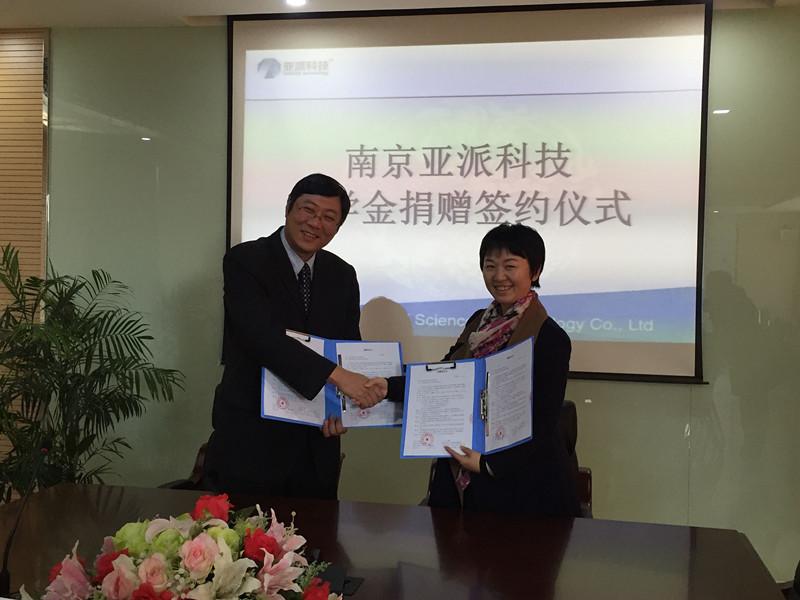 南京亚派科技股份有限公司总经理葛文海、我院党委副书记沈伯秀代表双方签订协议。南京亚派科技股份有限公司将出资20万元分5年资助番茄app 电气相关专业学习成绩优异、且家庭经济困难的本科生和硕士研究生。