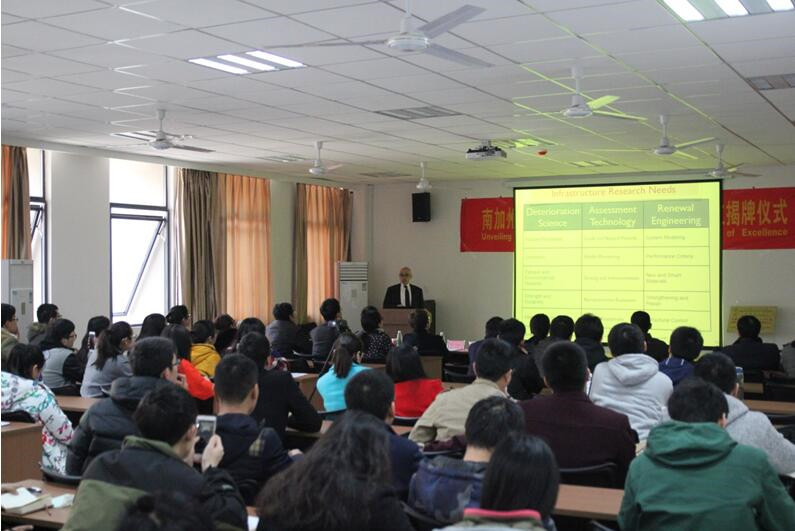 揭牌仪式后,Sami F Masri 教授为大家做了题为《”Smart Cities” – An Overview of Data-Driven Approaches for Structural Health Monitoring and Condition Assessment of Infrastructure Systems》的学术报告,对一些前沿的数据驱动方法在土木与机械系统健康监测方面的最新发展和应用进行了概述。在报告中,Sami F Masri教授首先对南加州大学Viterbi工程学院进行了简短的介绍,随后介绍了结构健康监测技术及其面临的技术挑战,着重介绍了基于振动和基于视觉两种方法在桥梁、建筑等系统结构健康监测中的应用。最后,Sami F Masri教授就报告内容与老师和同学们进行了热烈的交流与讨论,得到老师和同学们的热切关注和欢迎。