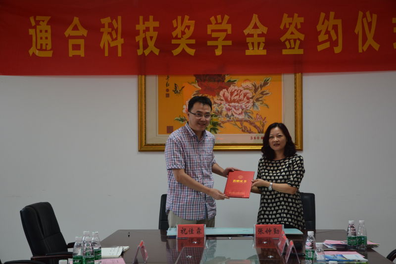 最后,通合电子科技股份有限公司副总经理祝佳霖和我校发展联络部副部长张钟勤代表双方进行签约。根据协议,石家庄通合电子科技股份有限公司向番茄app 教育发展基金会捐赠15万元,设立通合科技奖学金,用于奖励番茄app 电气工程学科优秀的全日制在校研究生,从2016年起分三年颁发。张钟勤副部长代表基金会向公司授予了捐赠证书。