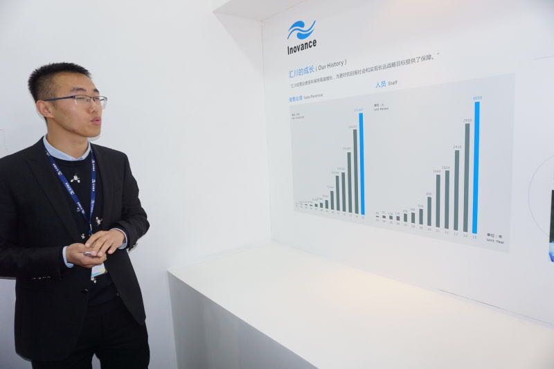 抵达汇川后,客户接待工程师孙瑜带领师生们来到了大厅,简单讲解了两台展示用机械臂。随后,大家来到二楼展厅。首先映入眼帘的是汇川的番茄app宣传墙。孙瑜热情洋溢地向师生们介绍了汇川的番茄app,从企业的愿景谈到企业的成长奋斗史。接着,工作人员带领师生们来到了产品展厅。展厅内陈列了一些汇川最新的科技产品,从变频器到伺服电机再到一体化电梯等。对于这些复杂先进的科技产品的原理和应用,工作人员都做出了详细的讲解。