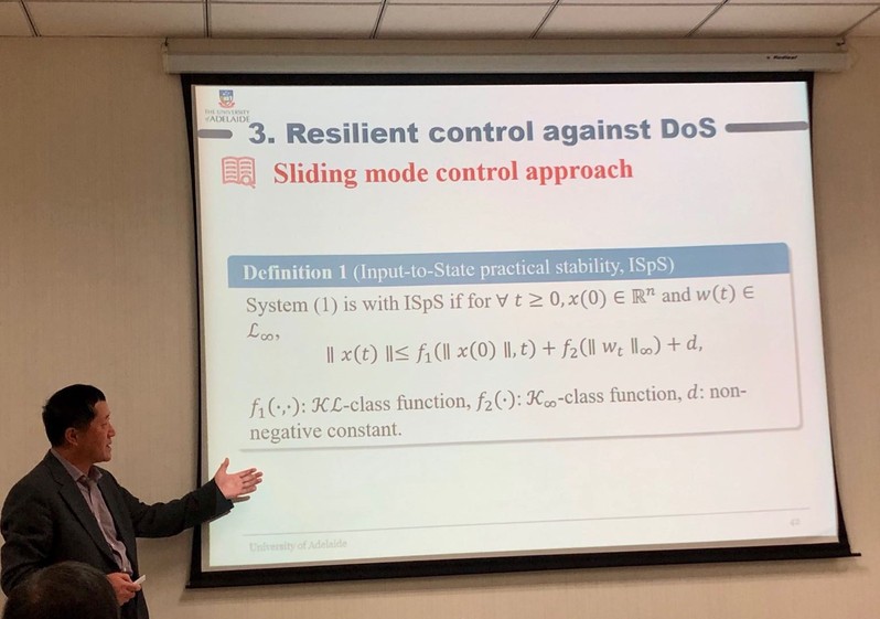 Shi教授首先对信息物理系统(Cyber-Physical System, CPS)的基本概念和应用背景做了简要介绍,并对CPS的历史发展脉络进行了梳理,指出了CPS的研究意义。接着,Shi教授通过拒绝服务(Denial of Service, DoS)攻击的基本概念,引出了CPS的安全目标,并简要讲解了他们团队正在研究的关于DoS攻击的主要问题。同时,结合CPS的物理背景,Shi教授介绍了基于滑模控制方法的抗DoS弹性控制策略。随后,Shi教授通过网络化控制系统的数学模型与安全状态估计方法,提出了基于CPS的安全防卫策略的设计,并展示了他们团队的最新研究成果。最后,Shi教授对CPS的未来研究方向和应用前景提出了展望。