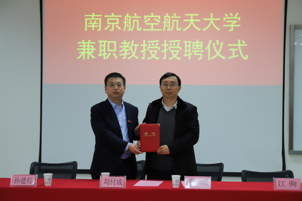 仪式上,姜斌为刘付成研究员颁发聘书并佩戴校徽,他代表学校对刘付成研究员受聘为我校兼职教授表示欢迎和祝贺。他指出,高水平大学发展需要高层次人才,刘付成研究员在飞行器导航、制导与控制技术研究取得较好的研究成果,希望双方在前期良好的合作基础上,继续加强对我校航天控制领域方面的指导,进一步提升学科建设实力、提高人才培养质量、创造更多研究成果!