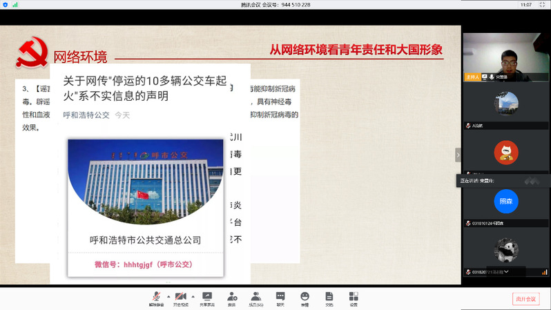 首先,宋昱锋同志从网络特点谈起,结合当下关于疫情的谣言实例,分析目前存在的问题。号召青年党员和青年学生增强知识储备、自觉抵制谣言、正确发表言论,面对国外网络上对于中国的不实攻击,更要理性判断,尊重文化差异,深刻认识中国在世界舞台的大国形象和大国担当。同时也鼓励参与本次党课的同志们肩负起当代青年应有的担当,树立“四个自信”,牢记使命,砥砺前行。