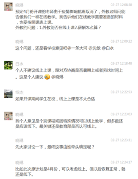 之后的时间,我们与外教、学生、助教老师等组成了微信群,在群内及时讨论课程相关的安排。考虑到上课方便与网络稳定性等因素,外教与学生对多款线上教学软件进行对比,最终确定Microsoft Teams作为上课的软件平台。并在正式上课前完成了试课,对采用软件进行网络授课进行了测试,效果良好。