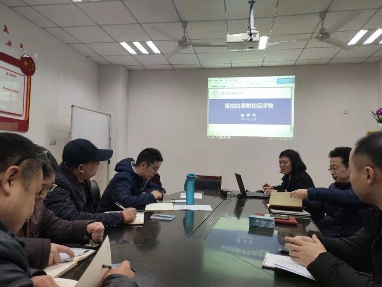 首先,支部纪检委员郭瑞鹏同志传达了学校、学院关于反腐倡廉工作的指示精神,带领支部成员学习了学校杭育新同志的《高校的腐败和反腐败》报告。该报告主要包括:腐败的概念及其生成要素、常见腐败心理剖析、高校的腐败与反腐败、建设清廉南航。