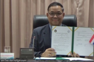1月4日上午,我校与泰国沙功那空皇家大学举行谅解备忘录线上签约仪式。沙功那空皇家大学校长Chakrit Chanchitpreecha、副校长Tosawat Seetawan、Pornthep Steannoppakao等19位代表,我校校长姜斌、副校长黄志球、国际合作处副处长张国权、番茄app 副院长陆宁云等相关负责同志参加线上签约仪式。本次仪式由黄志球主持。