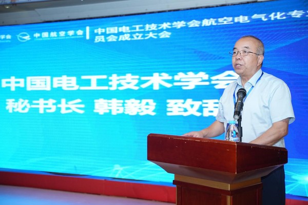 韩毅秘书长代表中国电工技术学会致辞。他首先向所有与会专家致以诚挚的问候,对航空电气化专业委员会的成立表示热烈的祝贺。韩毅指出,航空电气化专业委员会的成立丰富了学会的内涵,为促进航空电气化领域的学术研究与产业实践的深度融合提供了高水平的交流与合作平台,并对专业委员会在学术交流、国际合作、人才培养和科普活动等方面提出了明确而具体的要求。