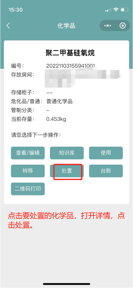 5.4如果系统单瓶剩余量比实际少,则点击化学品后,打开详情,将已有药品处置,并在处置后,重新点击新增化学品添加(先按照5.2操作,再按照5.1操作);