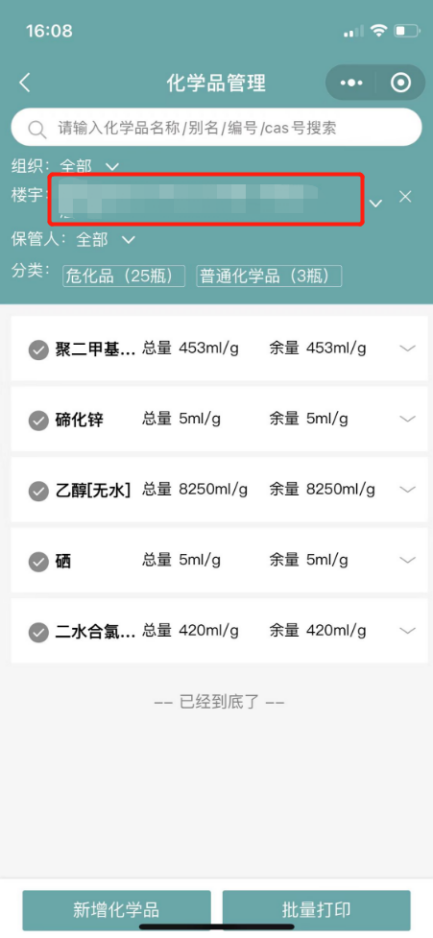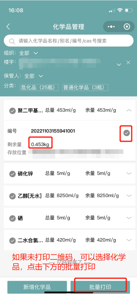 5.5如果需要打印系统化学品的二维码,则选择化学品后,点击下方的批量打印;