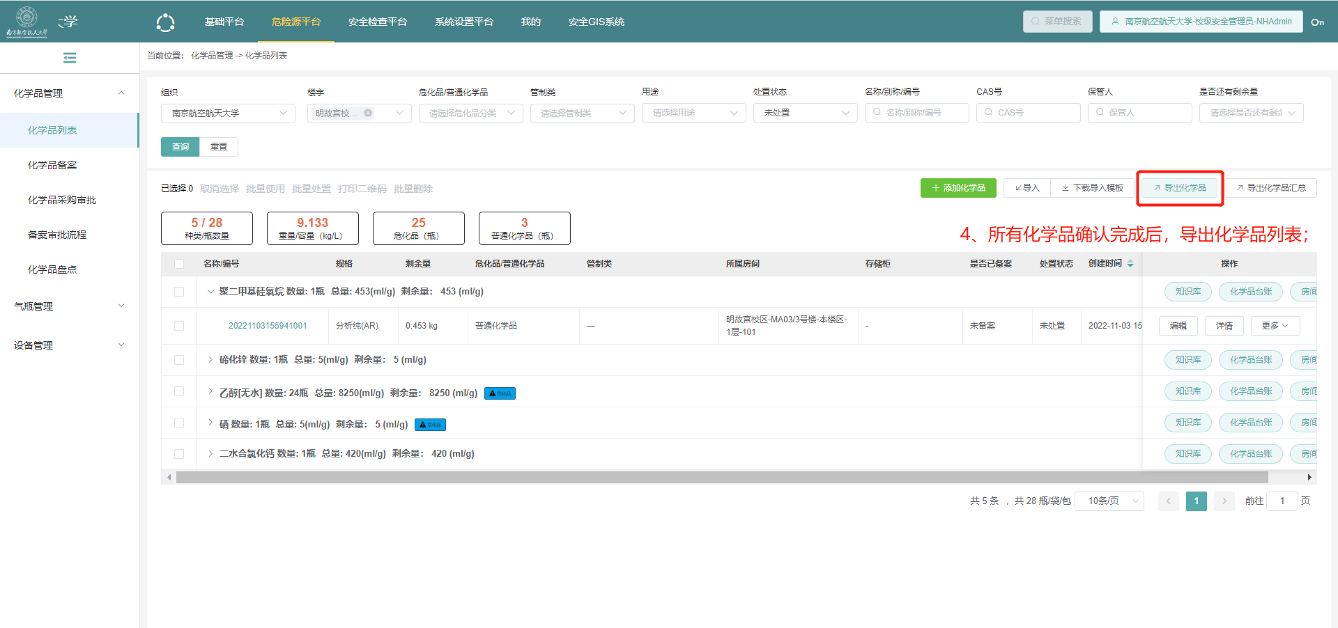 6.在所有品类的化学品都确认完成后,回到pc端,在化学品列表中导出房间的化学品清单。