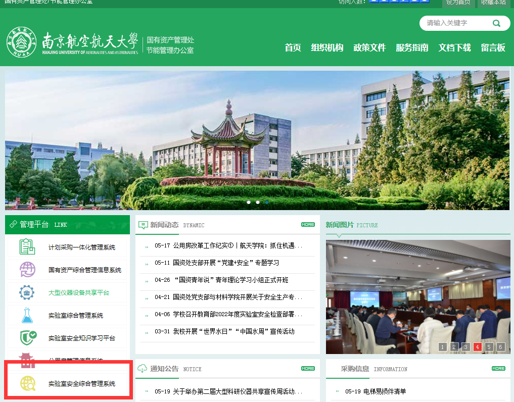 1.输入网址:gzc.fqappcn.com,访问国资处网站,点击“管理平台”栏目-“实验室安全综合管理系统”,采用校内统一身份认证的方式登录,具体操作如下图: