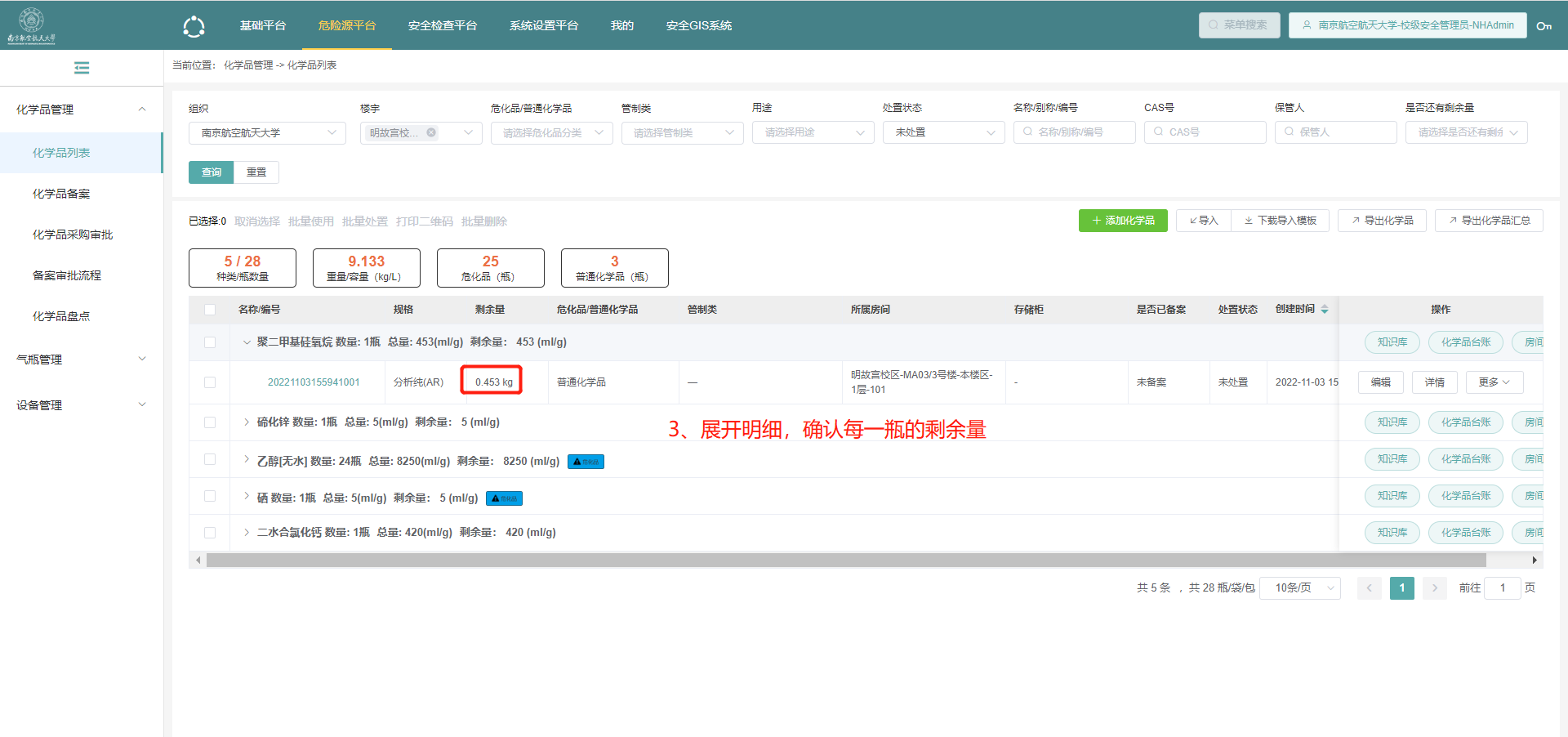 5.在确认了剩余量后,点击此化学品,展开明细;确认数量和每一瓶的剩余量;