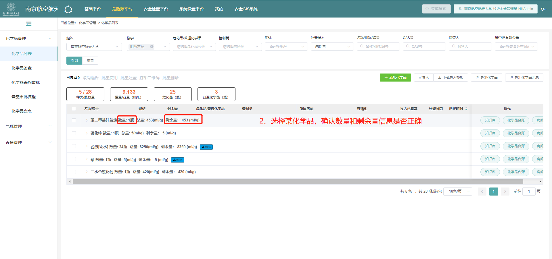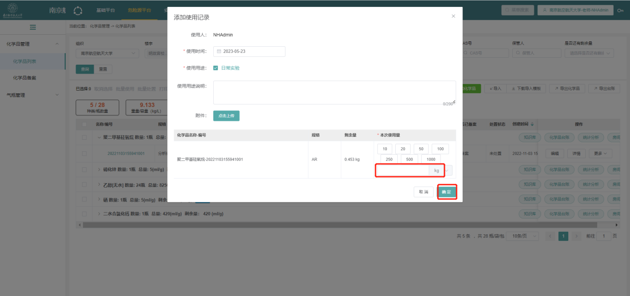4.选择某化学品,确认数量和剩余量信息是否正确;