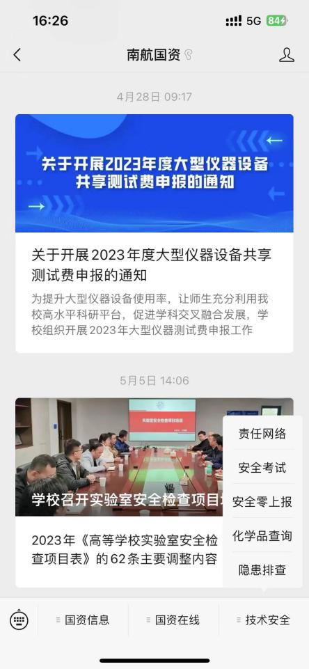 在微信中搜索“南航国资”,进入公众号后找到“技术安全”下的“隐患排查”点击进入“实验室安全管理平台-小程序”,