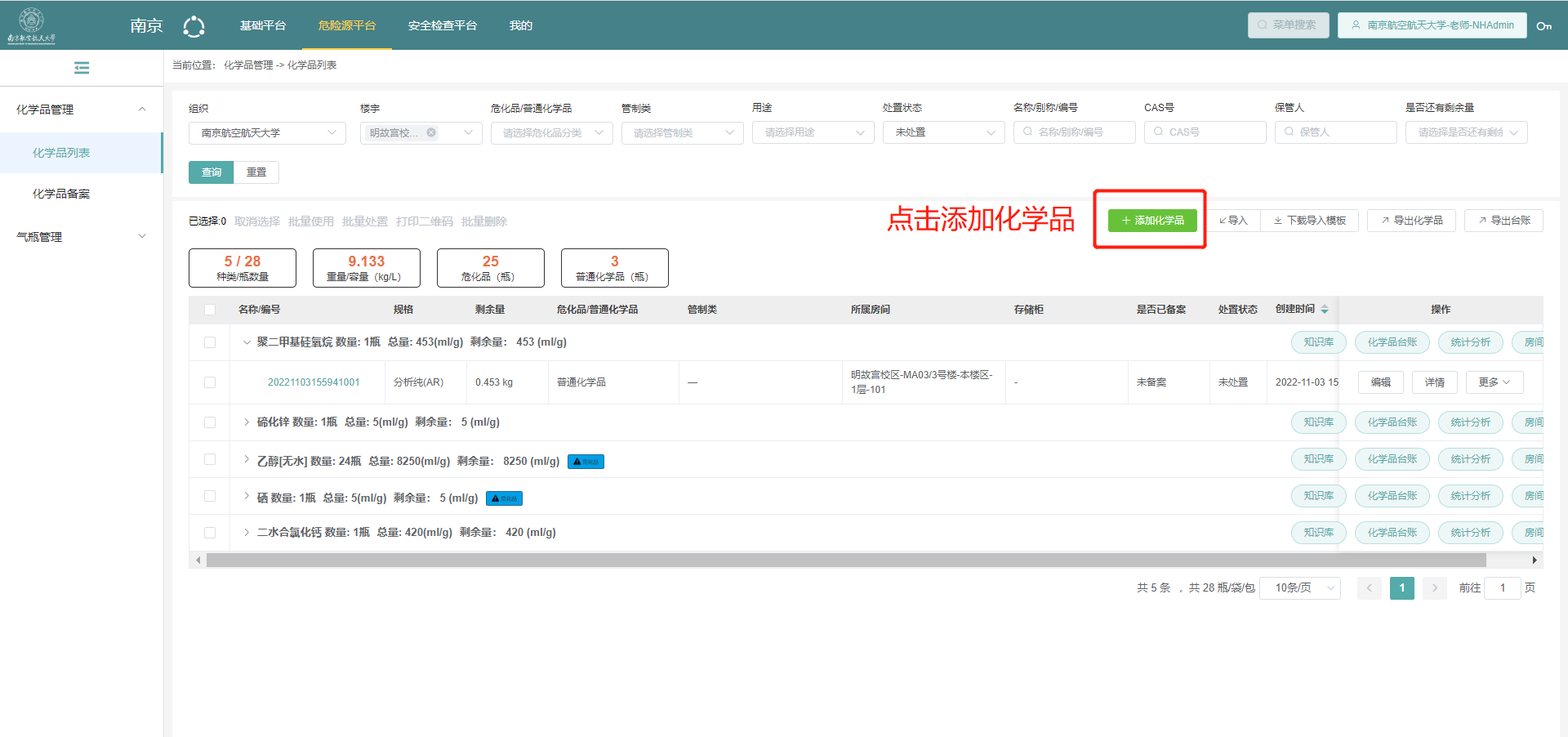 点击左侧功能条-“化学品管理”-“化学品列表”;