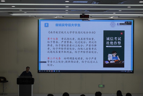 丁山解读了学校警示通告和违纪处分办法等相关管理规定,重点针对课堂纪律、安全管理、诚信考试等内容逐条解读,结合校园管理动态,引导同学们树牢“纪律红线不容触碰”的责任意识,进一步强化全体学生的行为规范。